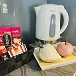 Das Apartment verfügt über eine voll ausgestattete Küche, die mit einer Mikrowelle, einem Wasserkocher und Küchenutensilien ausgestattet ist und für einen komfortablen Aufenthalt sorgt.